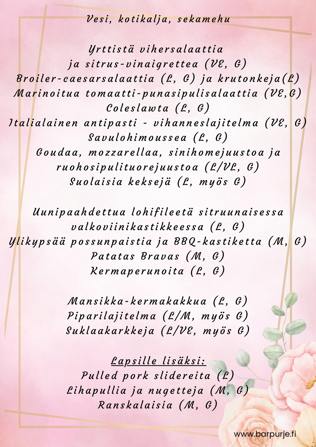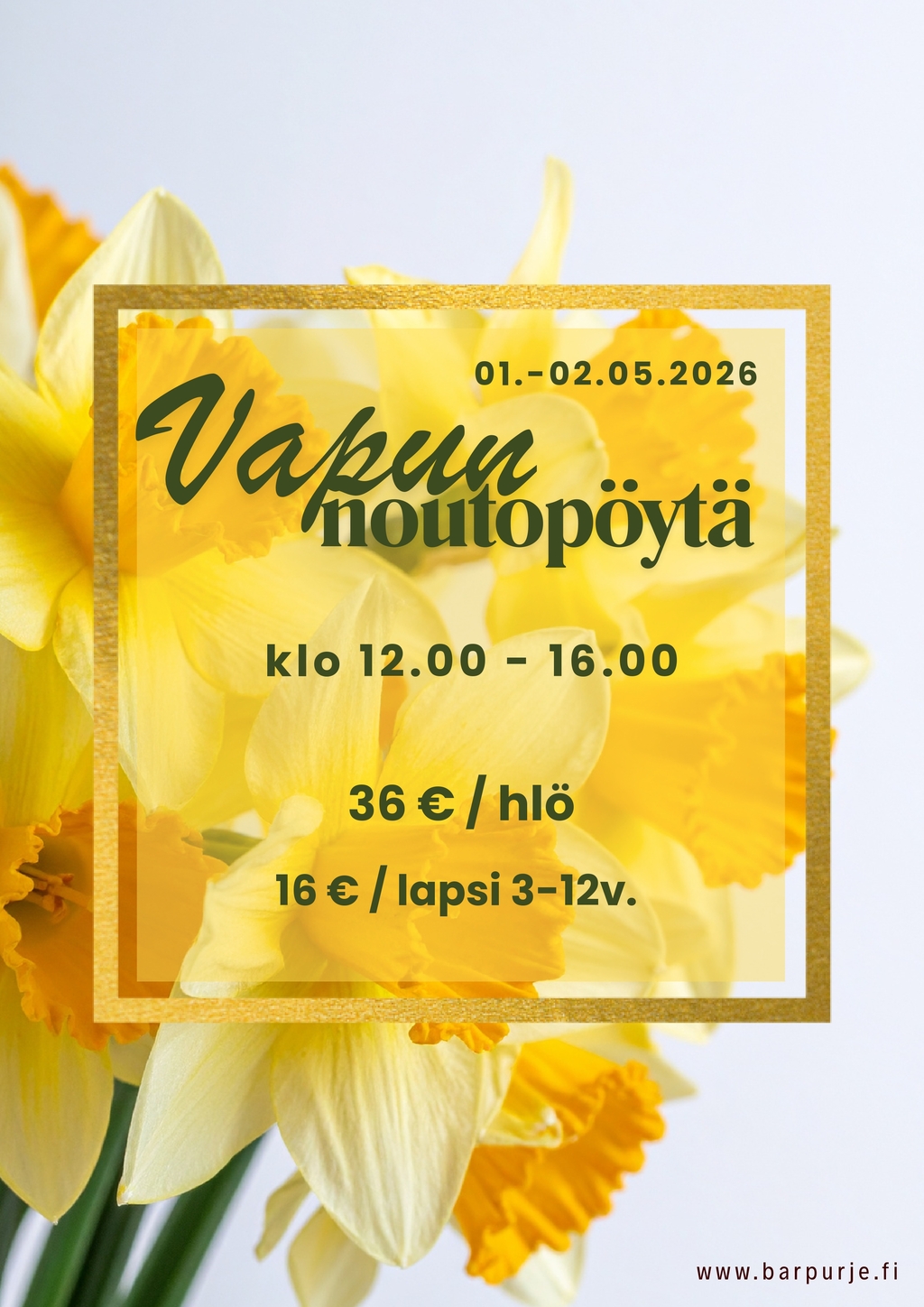 Paistettu siika 28 € Lämminsavulohi 26 € Purjeen sinisimpukat 27 € Pippuripihvi 39 € Grillipihvi 39 € Lehtipihvi 24 € Halloumibroileri 25 € Purjeen Smash burger 19 € Hot Kot burger 19 € Halloumiburger 18 € | |
