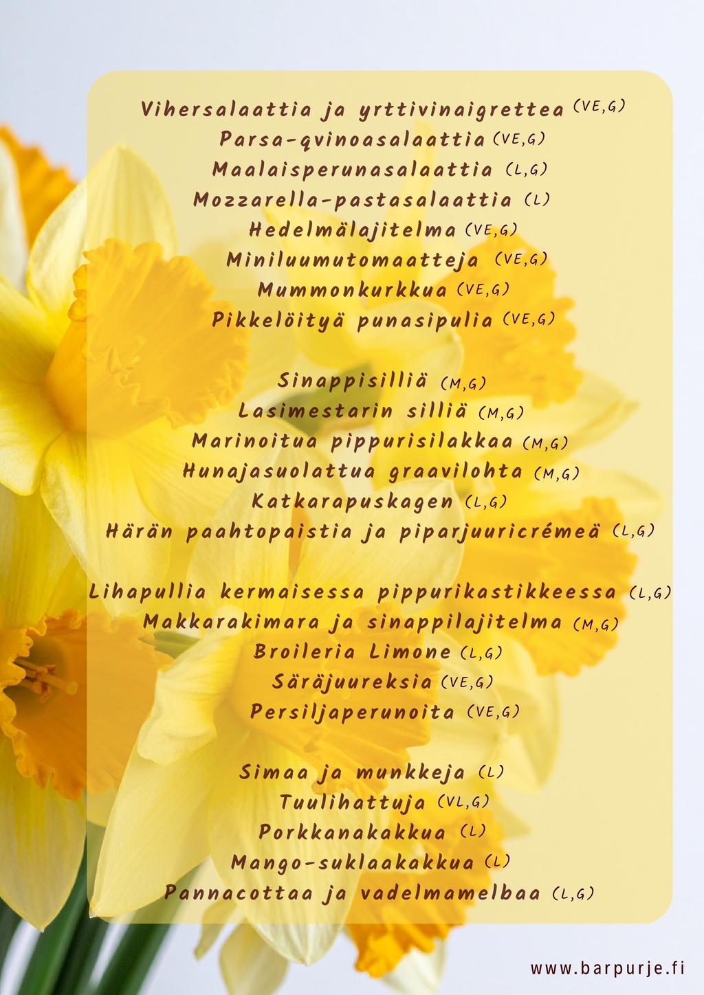 Talon salaatti alku 8 € / pää 13 € Lisää salaattiin Laitakarin lohikeitto Kalalautanen | |