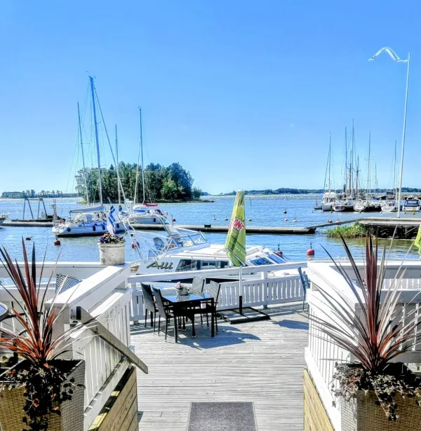 Terassilla on mukava viivähtää ja nauttia virkistäviä juomia auringonpaisteessa, lempeän merituulen vilvoittaessa.